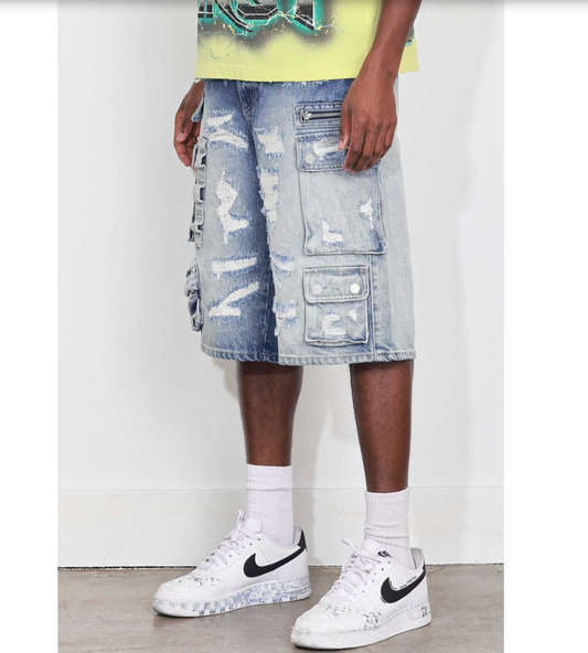 Washed Multi Cargo Denim Jorts - Light Blue