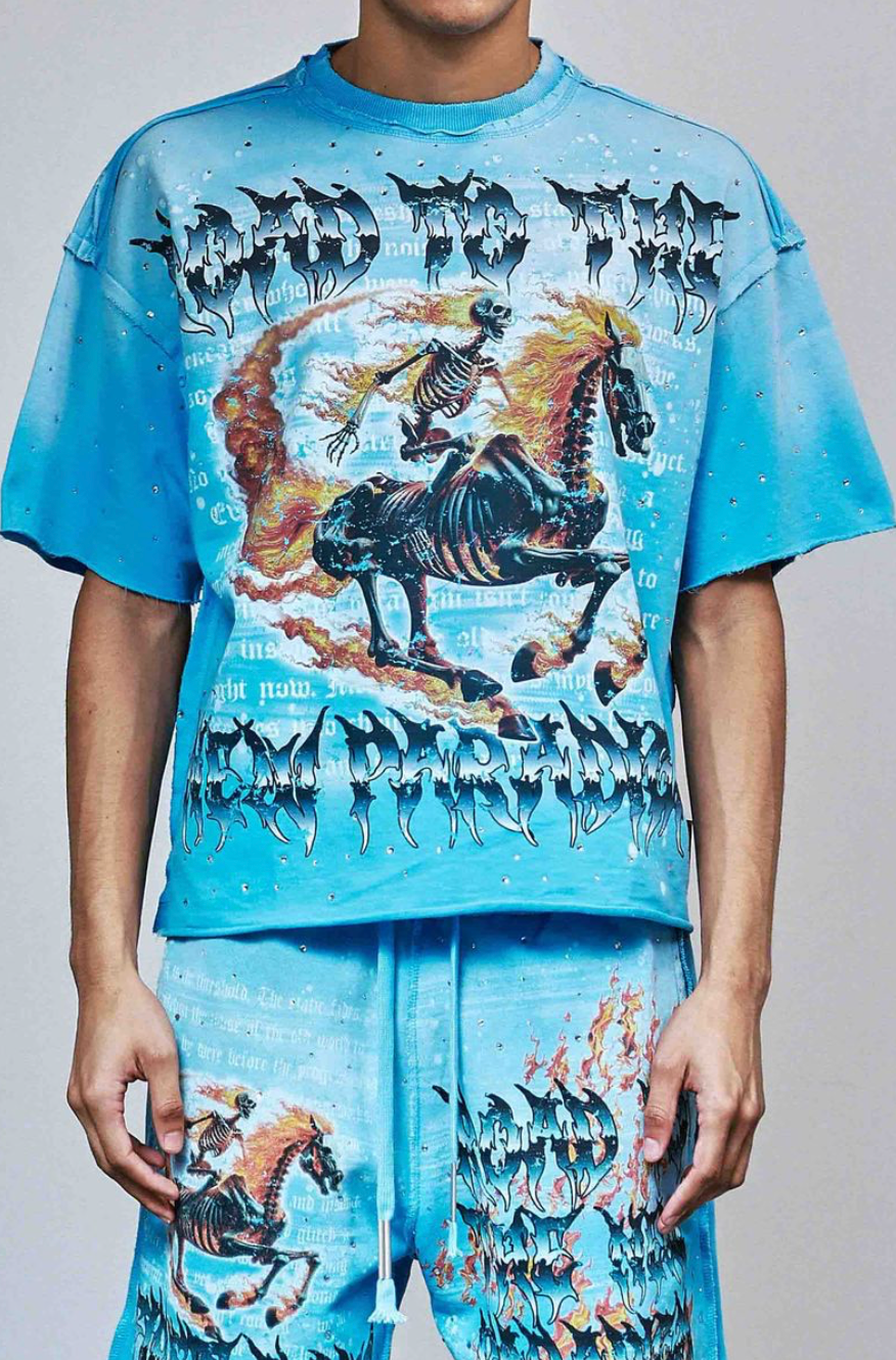 The First Row Paradigm Cropped Tee in blue delivers a contemporary silhouette with its cropped cut and relaxed proportions, while the ribbed neckline ensures a secure, flattering fit. Wide-open sleeves provide unrestricted movement and a modern aesthetic perfect for layering or standalone wear.