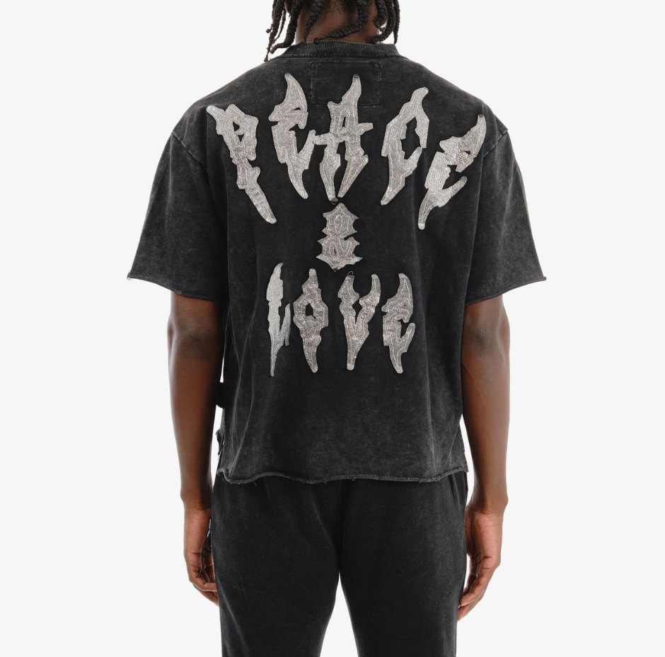 The Peace and Love Cropped Tee in black offers a sleek, modern cut designed for streetwear enthusiasts seeking comfort and style. Crafted for a confident, contemporary look, it pairs effortlessly with urban wardrobes.