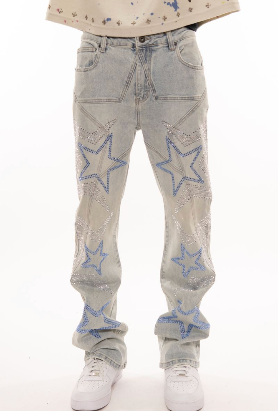 Combining star motifs with mini rhinestone accents, these blue stacked jeans deliver layered visual interest and premium detailing. The fitted stacked silhouette pairs perfectly with the sparkling embellishments for a look that balances contemporary edge with refined sophistication.