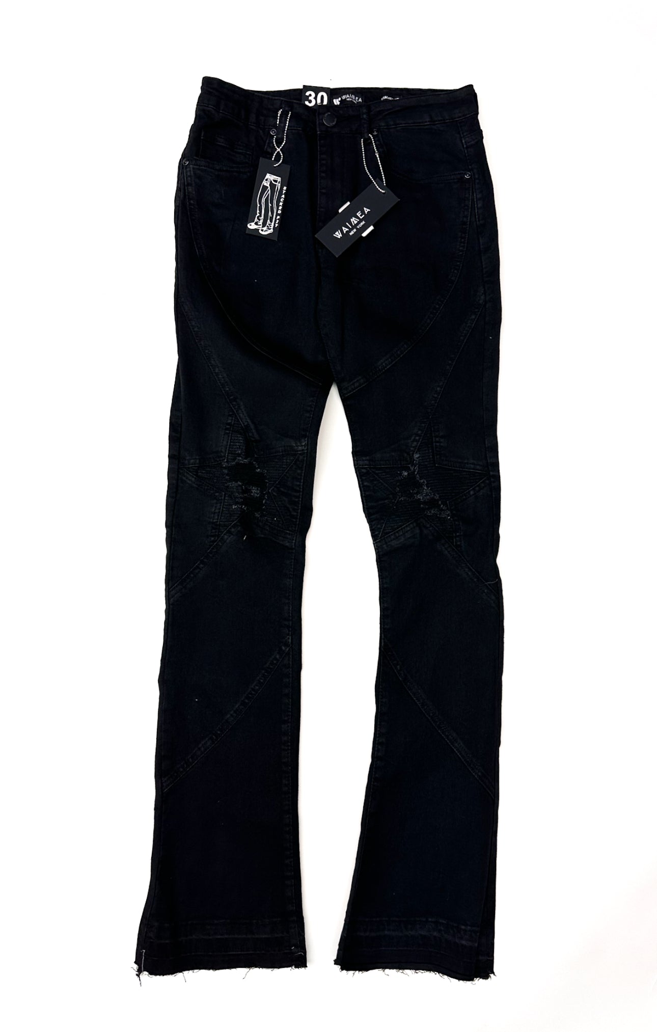 These stacked flare denim jeans offer a timeless silhouette with a modern twist, featuring a flattering fit that elongates the legs. Crafted with attention to detail, they provide both comfort and style, making them a versatile addition to any wardrobe. Perfect for elevating everyday looks with a subtle vintage-inspired edge.
